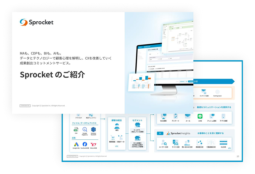 Sprocketの特徴、MA・CDP・BI・AIの機能、コンサルティングサービス、事例などをご紹介します。